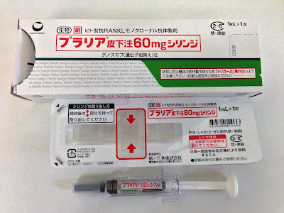 こちらは、【プラリア(デノスマブ:遺伝子組換え)】という名称で『抗RANKL抗体製剤』とも呼ばれる注射薬です。