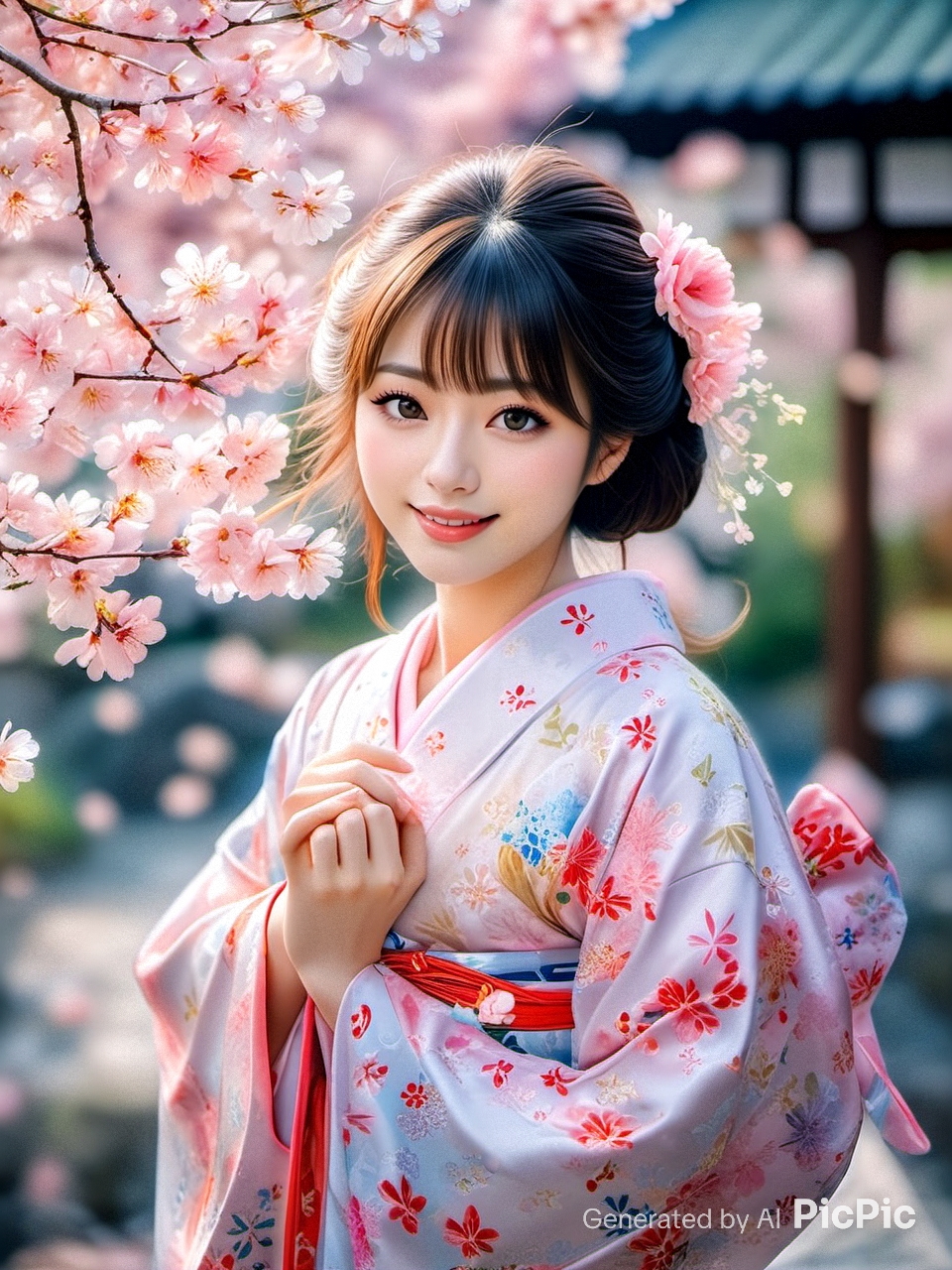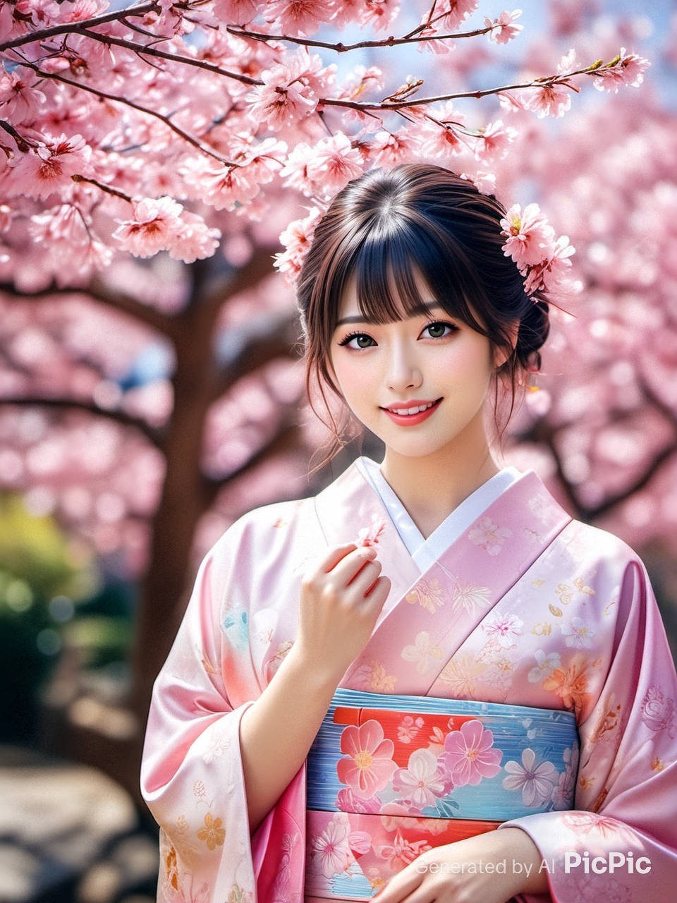 それでは、あんまり春っぽいかはわからないけど、桜のつもりでピンクのお着物のAIイラスト🌸