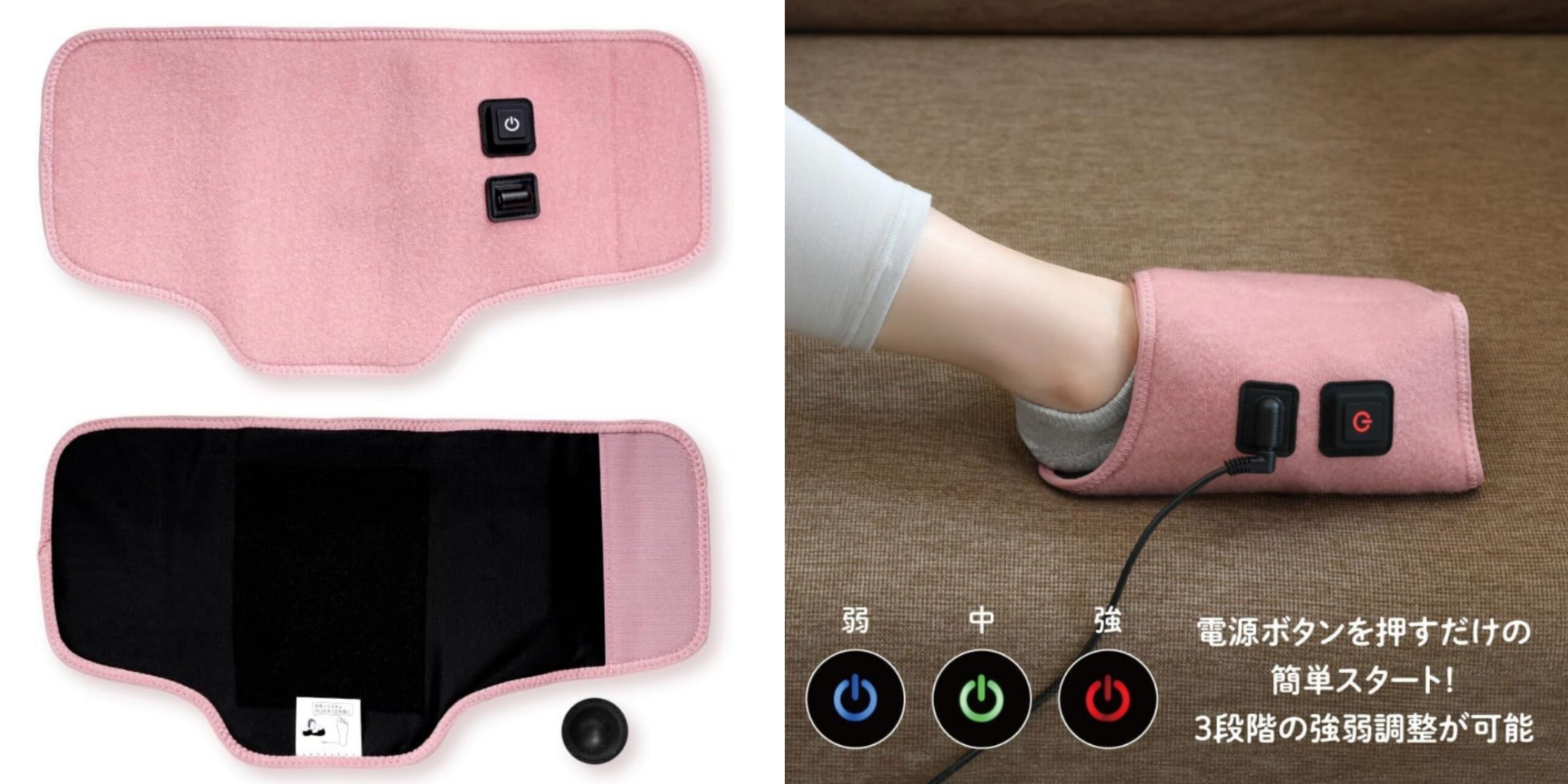 面ファスナーだから足に巻くだけの簡単装着。ボタン一つで電源オンオフ/強さ調整の操作が可能。だれでも簡単に使えます。