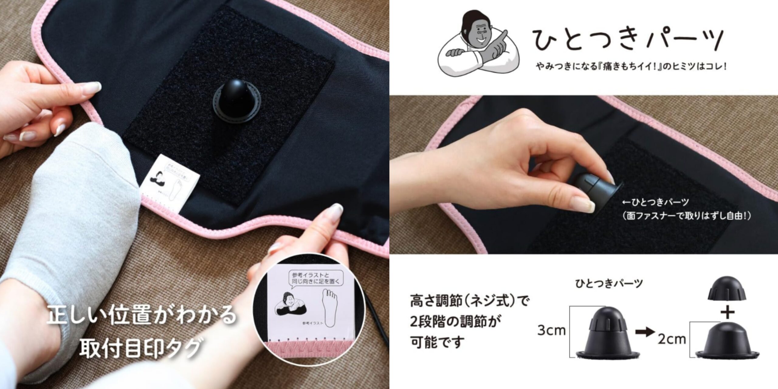 ひと突きパーツと強力ポンプ。ピンポイントでぐーっと押し込む『ひと突きパーツ』が痛きもちイイ。ゴリラのハイパワーシリーズの強力ポンプとの組み合わせで足うらをすっきりとケアします。ひとつきパーツは、2段になっていてお好みの強さ(高さ)に調節可能。底面は面ファスナーになっているので、位置も調整できます。