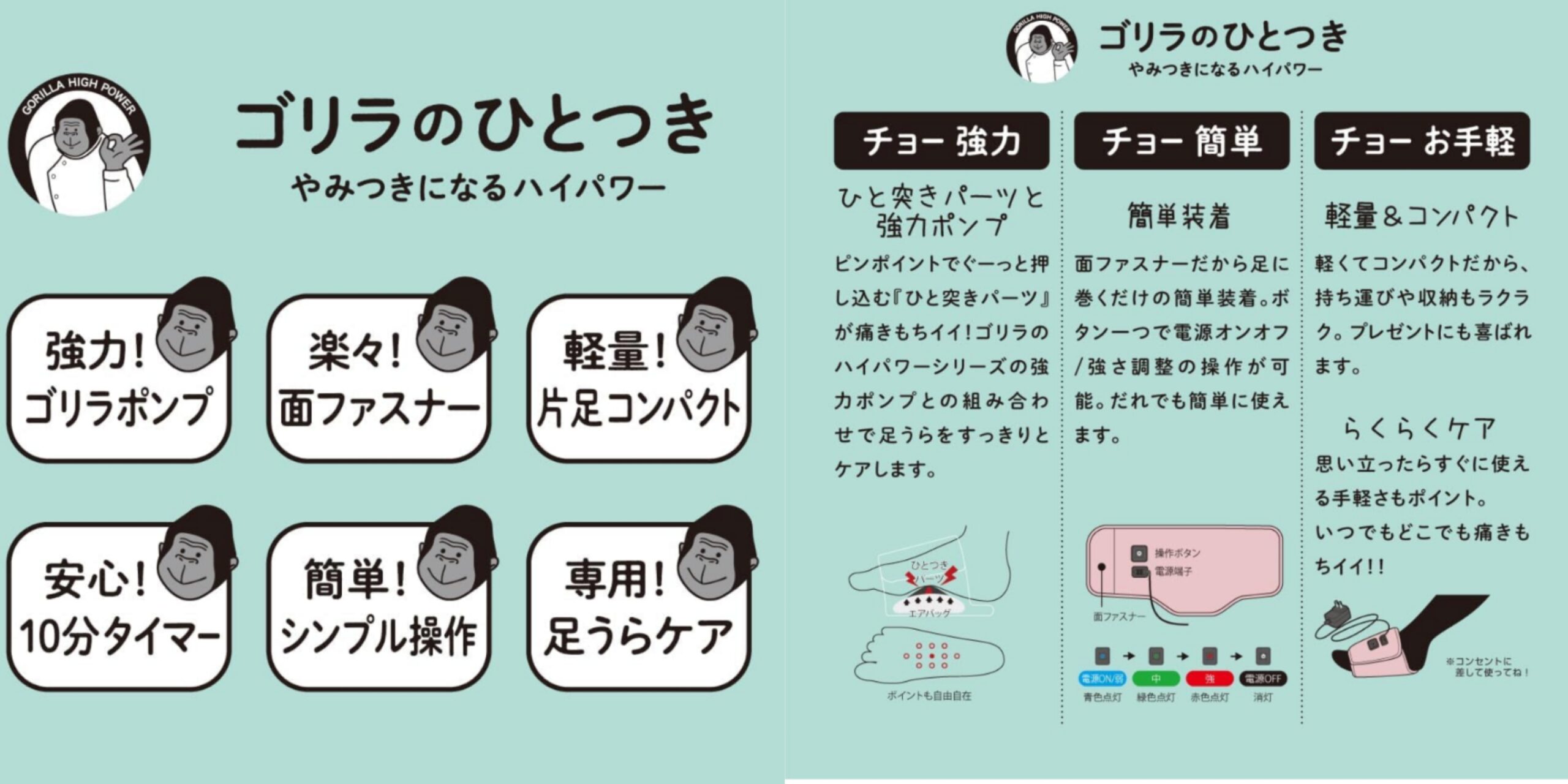 まるでゴリラにぐーっと突かれるようなハイパワー電動足うらケア ゴリラのひとつき。 足の疲労とお悩みに、ツボ押しのような痛きもちイイがやみつきになるゴリラのハイパワーシリーズ『ゴリラのひとつき』が誕生しました。いつでも気軽にお使いいただける簡単・お手軽タイプです。