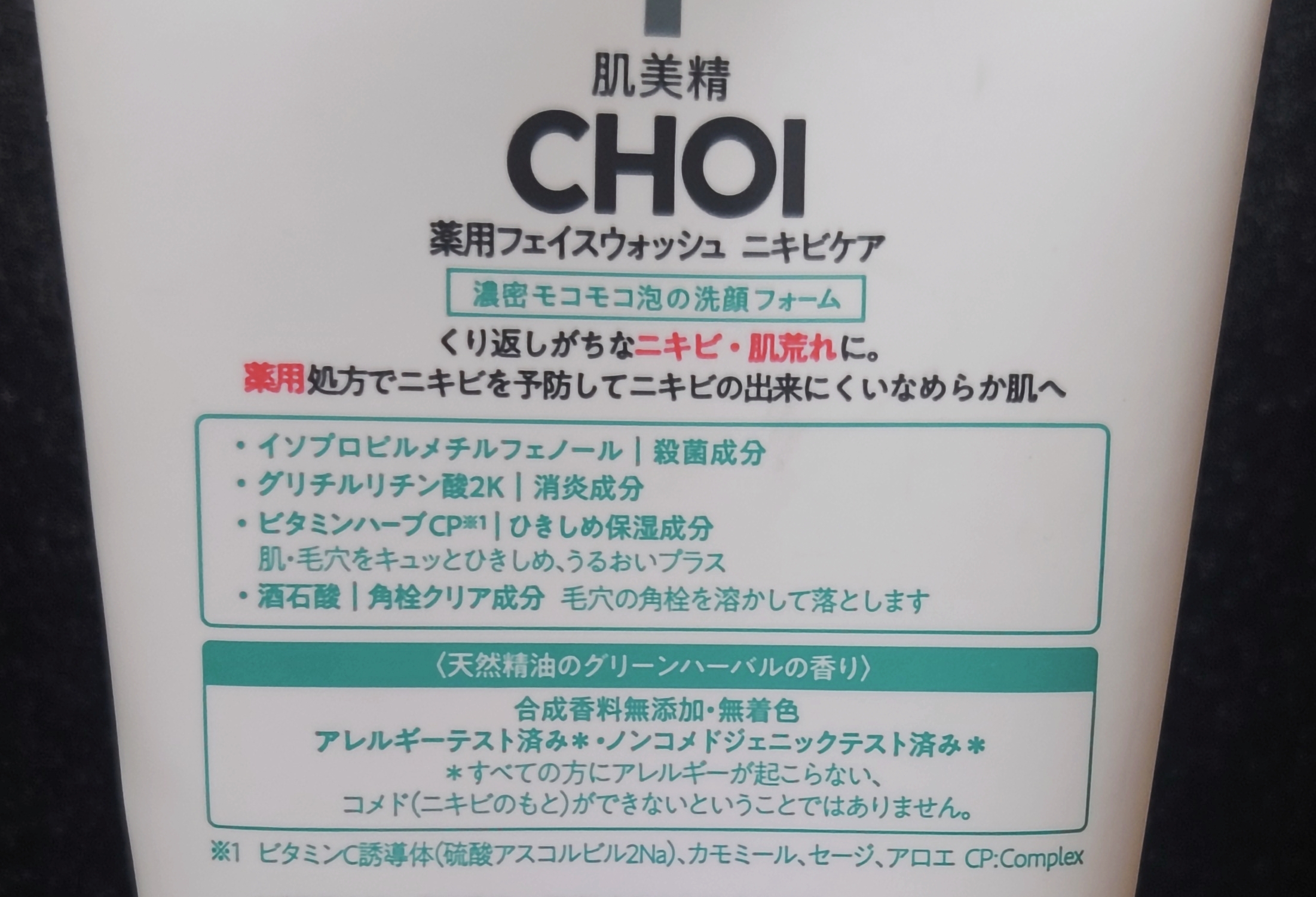 薬用成分の明記や、予防の明記、毛穴の角栓を溶かして落とす(洗浄効果)、そして「ニキビができない」ではなく「できにくい」という表現を用いていることがわかりますね。「治る」ではないです。