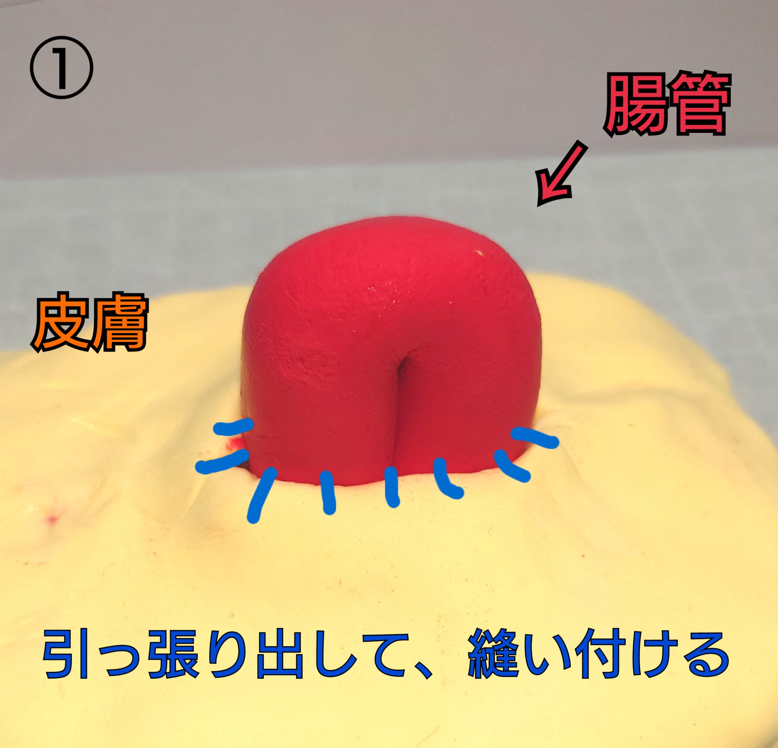『お腹を少し切開し、そこから腸管を少しだけ引っ張り出します。そして外に露出させた腸管を半分くらい切って割って、皮膚に縫い付けて固定します』