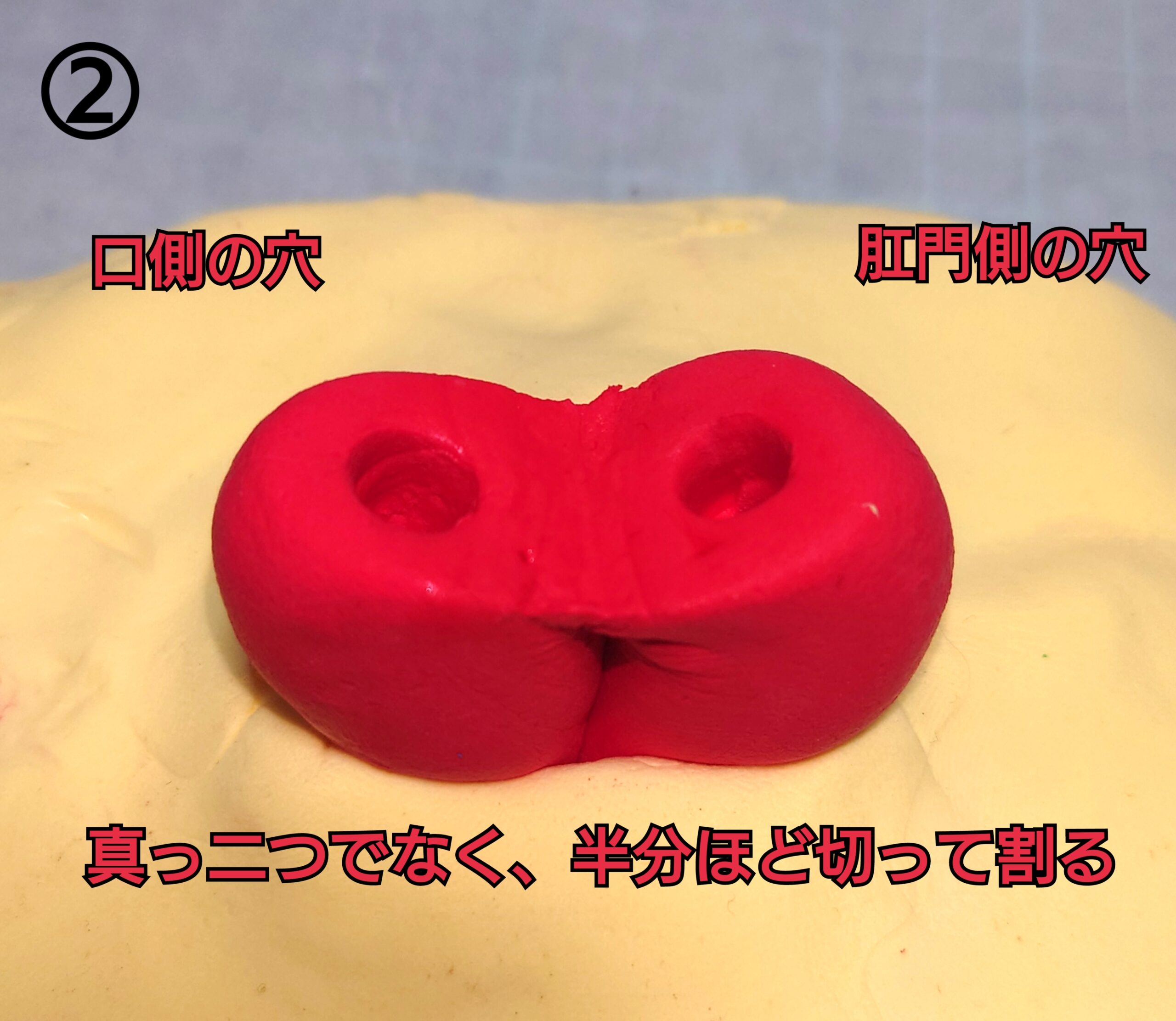 切り割りした腸管は、穴が2つになりますよね。一方は口側、もう一方は肛門側。口側の穴から排泄をし、肛門側からは少し粘液がでるだけになります。
