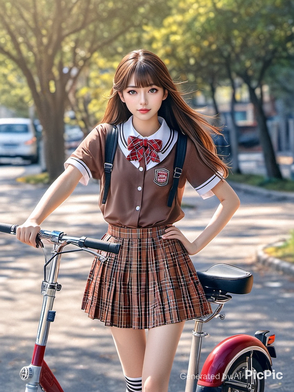 春の通学風シーン・自転車に乗る学生風の女性(架空のオリジナルAI生成イラスト)