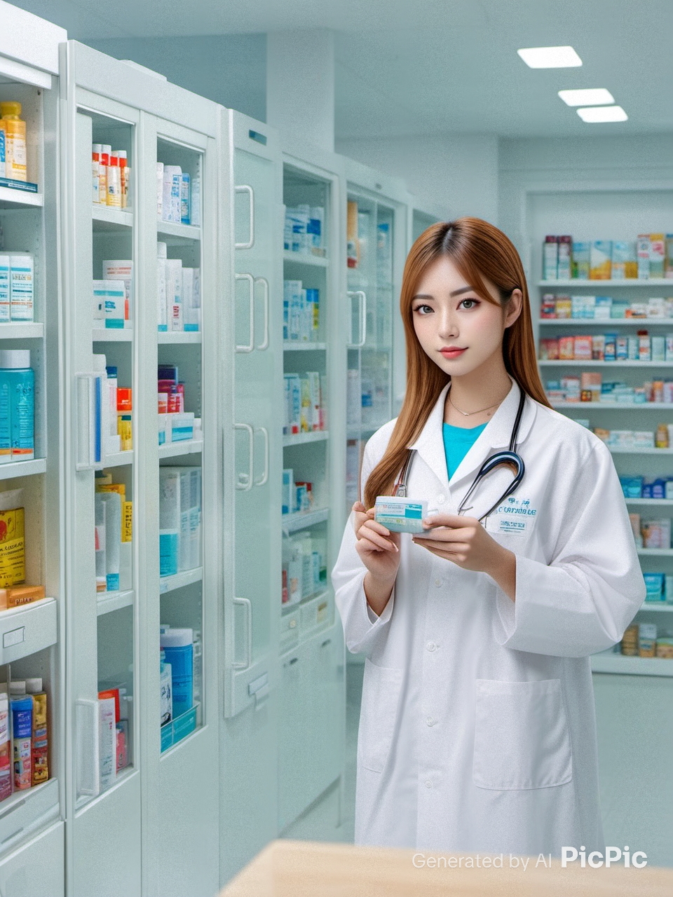 薬局で働く女性スタッフ・医療職のイメージ(架空のオリジナルAI生成イラスト)